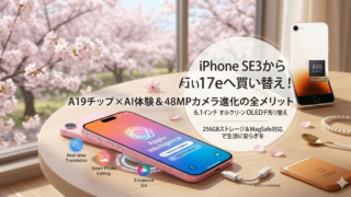 iPhone SE(第3世代)からiPhone 17eへの買い替えメリットを徹底解説。最新のA19チップによるAI機能、6.1インチOLEDディスプレイ、48MPカメラ、MagSafe、256GBストレージ、高速5G通信など、2026年3月発表の最新情報を基に、あなたのデジタルライフを革新する理由を深掘りします。