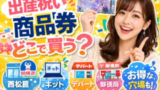 出産祝いの商品券をどこで買うか迷っている方必見!西松屋・赤ちゃん本舗の購入方法から、デパートに行けない方向けのネット完結術、失礼にならない贈り方・のし・金額相場まで、3人出産経験者の筆者が実体験をもとに徹底解説します。