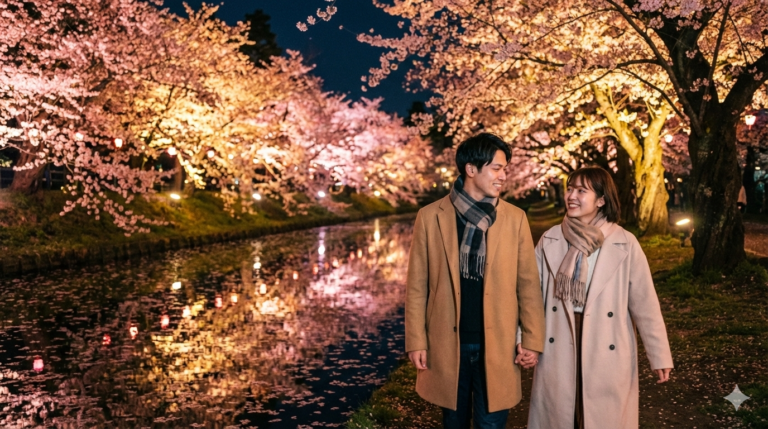 弘前の夜桜は、景色そのものがデートになります。だからこそ勝ち筋はシンプルで、日没前に到着→日没直後に撮る→混む前に離脱→大浴場で温まる。